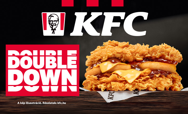 Ebben a burgerben megdupláztunk, ami igazán fontos: a Double Down megérkezett a KFC-be! Két aranybarnára sült Zinger csirkemell között két szelet cheddar sajt, két hagymakarika, ropogós bacon és karakteres BBQ szósz. Keresd a KFC-ben!
